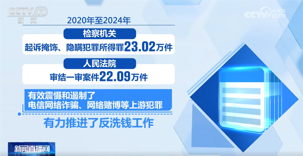据了解,2020年至2024年,检察机关起诉掩饰、隐瞒犯罪所得罪23.02万件,人民法院审结一审案件22.09万件,有效震慑和遏制了电信网络诈骗、网络赌博等上游犯罪,有力推进了反洗钱工作。