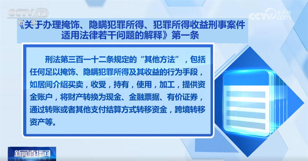 《解释》主要包括以下内容:一是进一步严密刑事法网。针对实践中犯罪手段不断翻新甚至隐形变异的形势,《解释》第一条规定,刑法第三百一十二条规定的“其他方法”,包括任何足以掩饰、隐瞒犯罪所得及其收益的行为手段,如居间介绍买卖,收受,持有,使用,加工,提供资金账户,将财产转换为现金、金融票据、有价证券,通过转账或者其他支付结算方式转移资金,跨境转移资产等。指导司法机关依法惩治各种类型的掩饰、隐瞒犯罪所得行为,让犯罪分子无处遁逃,充分体现了我国反洗钱法律制度的严密性。