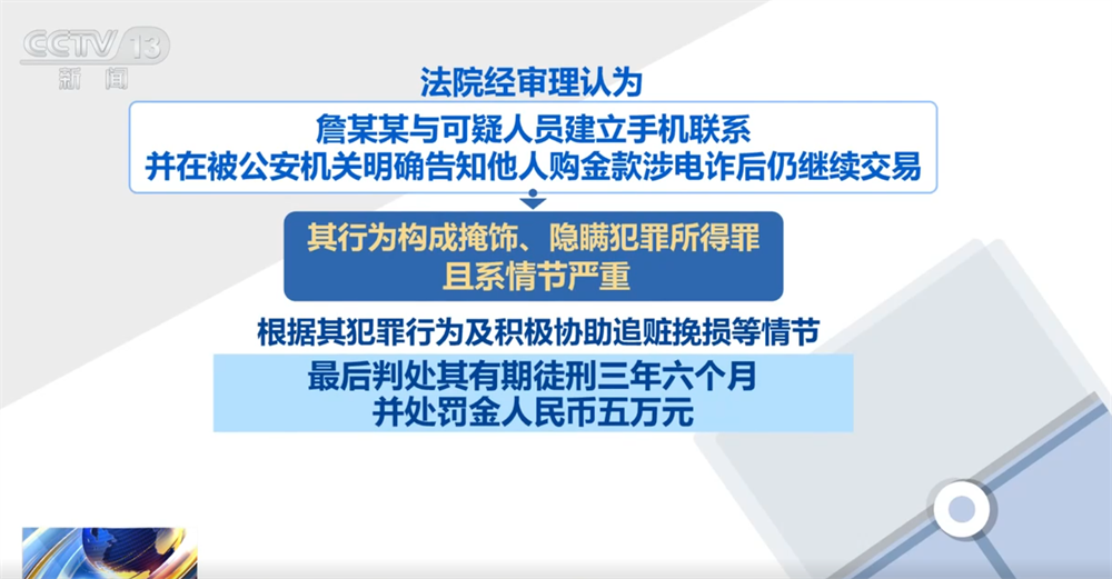 法院经审理认为,詹某某与可疑人员建立手机联系,并在被公安机关明确告知他人购金款涉电诈后仍继续交易,其行为构成掩饰、隐瞒犯罪所得罪,且系情节严重。根据其犯罪行为及积极协助追赃挽损等情节,最后判处其有期徒刑三年六个月,并处罚金人民币五万元。